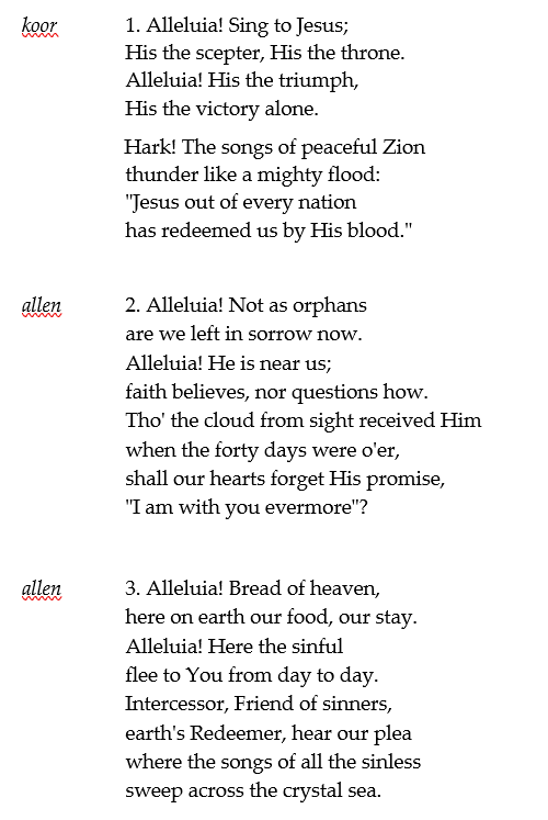 New English Hymnal 271 ´Alleluia, sing to Jesus´ : 1 koor, 2 , 3 allen